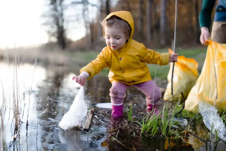 Et barn i gul regnjakke som plukker en plastpose ut av et vann.