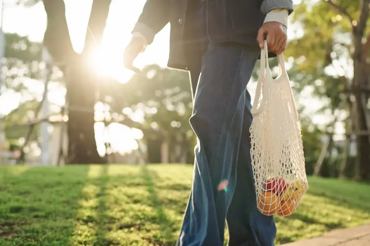 Et bilde av noen som går ute med et handlenett med frukt i.