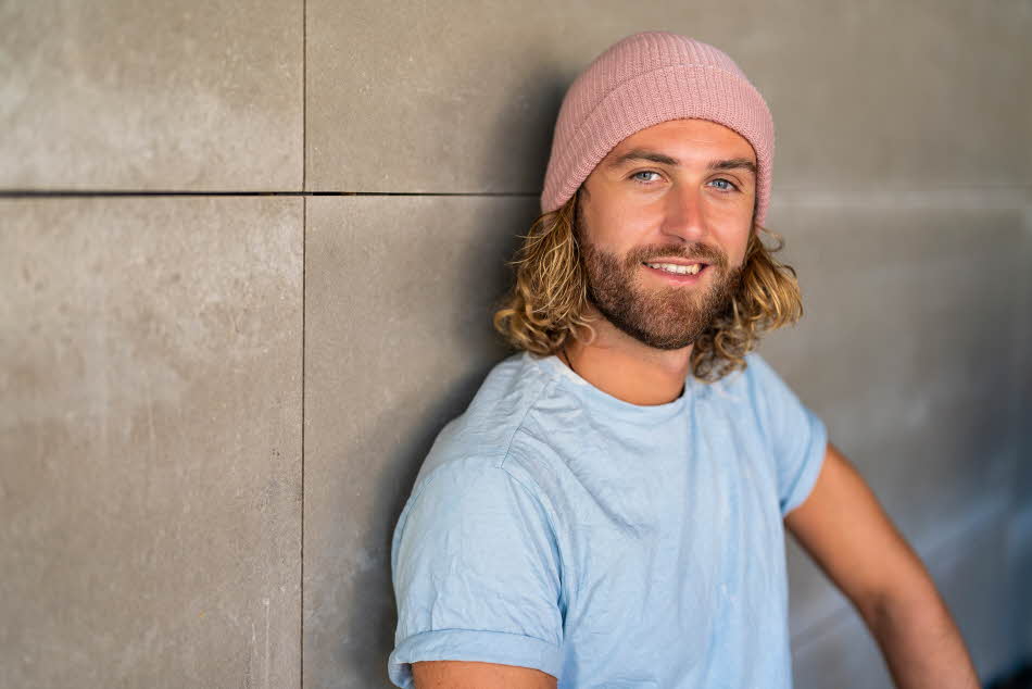 Mann med grå t-skjorte og lys rosa strikkelue smiler til kamera